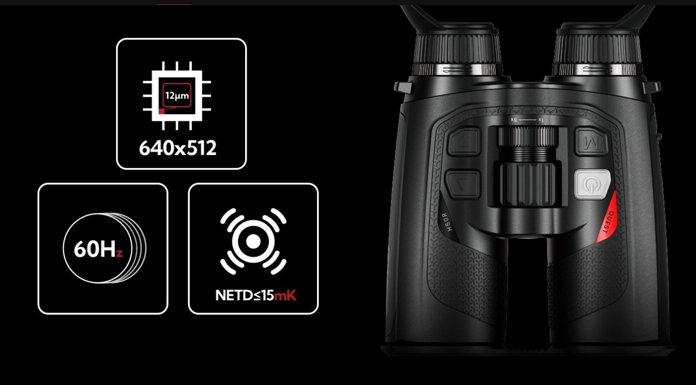 The QUEST is lightweight and portable, offering a detection range of up to 2600m and a built-in concealed LRF with a 1000m range for superior accuracy and visibility. Its traditional binocular design features a full-rubber coating and an IP67 rating for durability and comfort in harsh conditions. Equipped with a high-performance 640x512 sensor (NETD ≤15mK, 60Hz), the QUEST ensures exceptional image clarity, superior thermal sensitivity, and seamless performance in challenging environments.